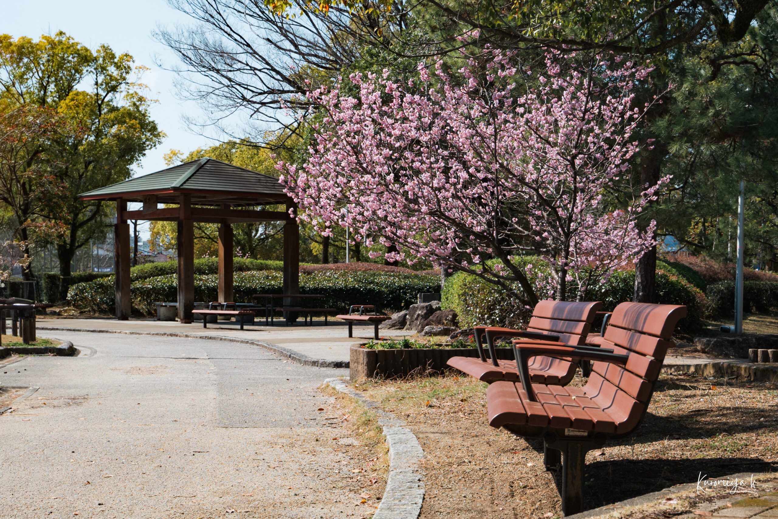 城西公園にはいたるところに河津桜があって、入り口付近も公園の遊具付近も見ごろを迎えています。